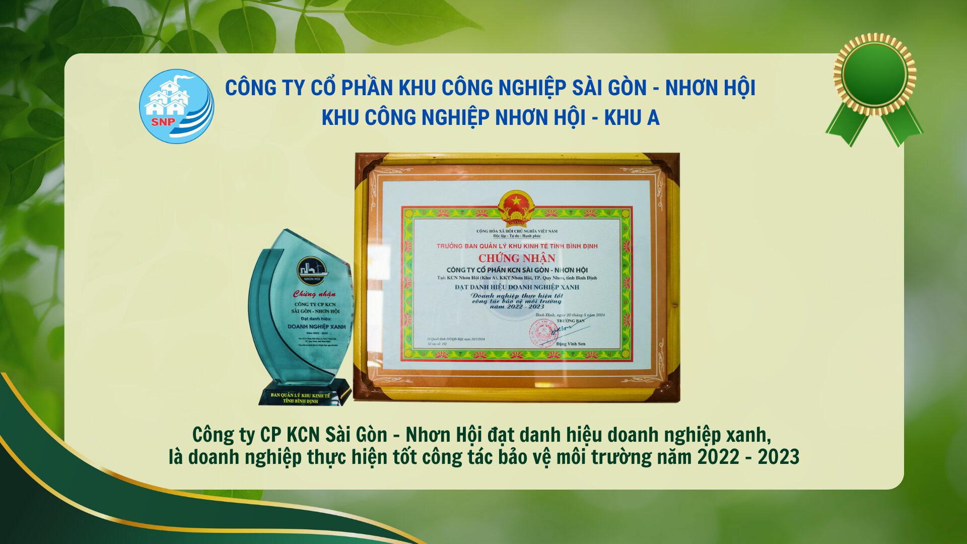 At this ceremony, Saigon–Nhonhoi Industrial Park Corporation (SNP) was honored and received a certificate and a commemorative medal for performing well in environmental protection for 2022 – 2023.