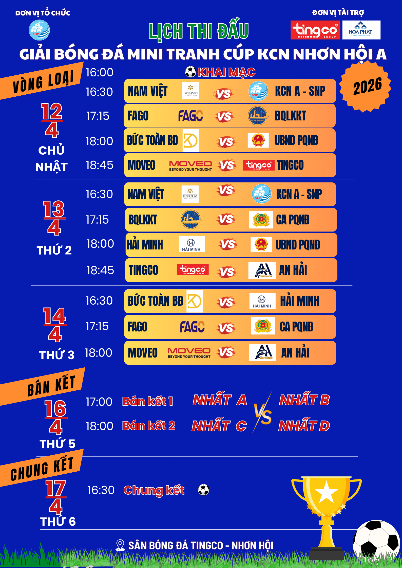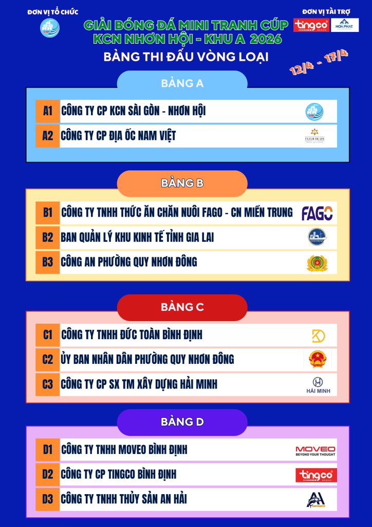 Từ 12/4 – 14/4: Vòng loại diễn ra liên tục với những màn so tài kịch tính giữa các đội bóng đến từ các doanh nghiệp, đơn vị trong KCN Nhơn Hội A và chính quyền địa phương.