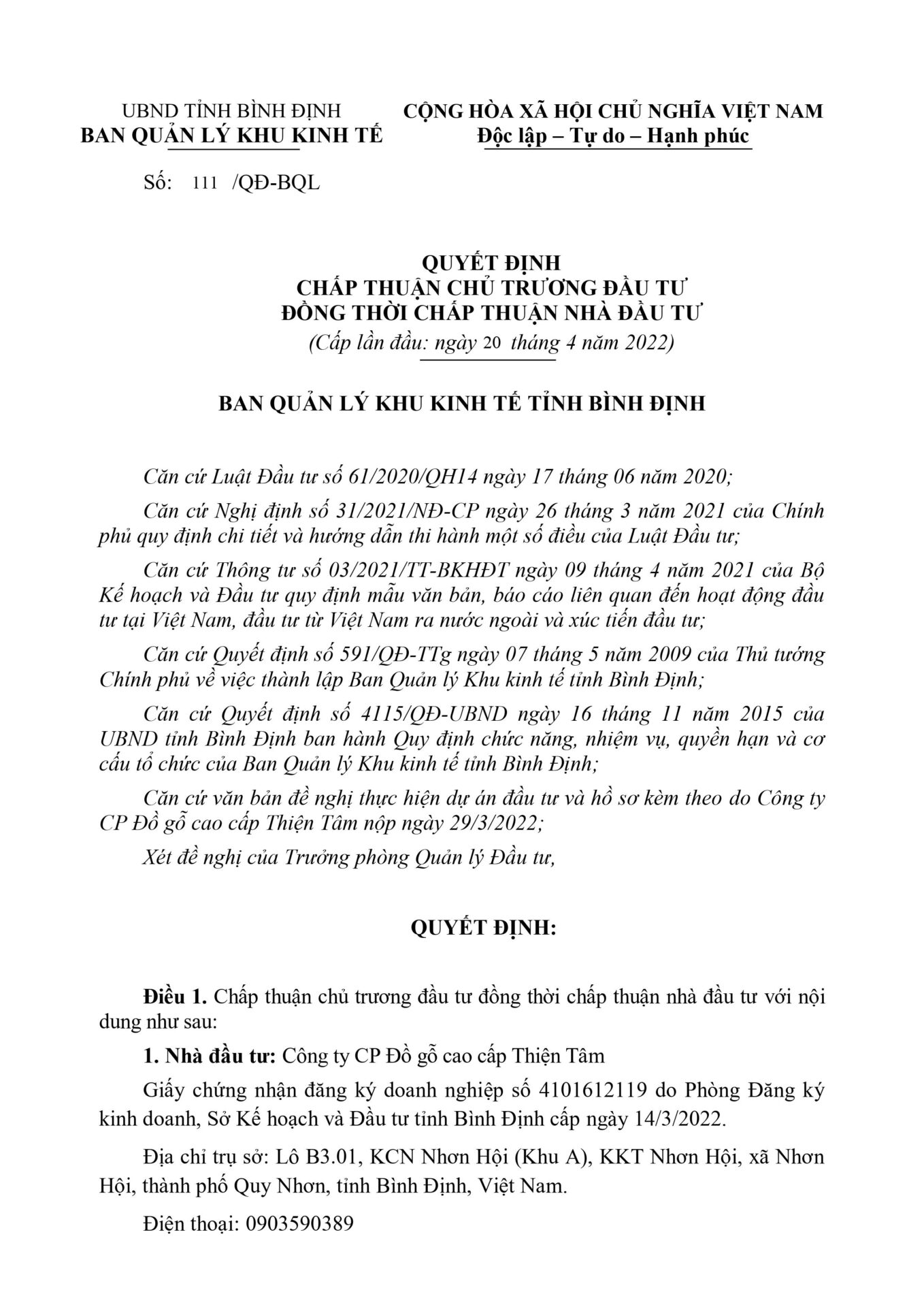Theo đó, Ban Quản lý Khu kinh tế thuộc Ủy ban nhân dân tỉnh Bình Định đã Chấp thuận chủ trương đầu tư, đồng thời cho phép công ty Cổ phần Đồ gỗ cao cấp Thiện Tâm thực hiện dự án xây dựng nhà máy sản xuất giường, tủ, bàn ghế, các vật dụng nội, ngoại thất bằng gỗ cùng các vật liệu khác trong thời gian 50 năm (tính từ ngày nhà đầu tư được cấp Quyết định chấp thuận chủ trương đầu tư).