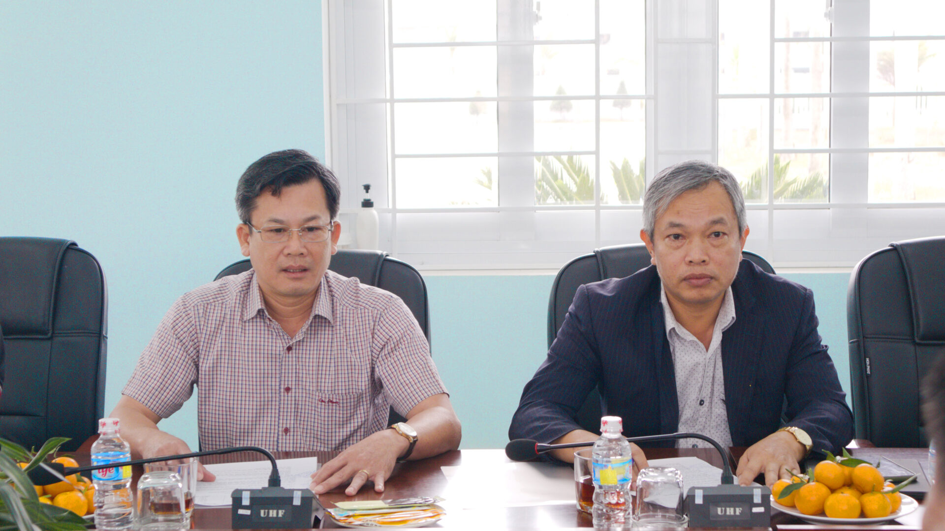 Ông Đặng Vĩnh Sơn, Trưởng ban Ban Quản lý Khu kinh tế tỉnh (người ngồi đầu tiên từ bên phải sang) và ông Cao Thanh Thương, Phó Trưởng ban Ban Quản lý Khu kinh tế tỉnh Bình Định