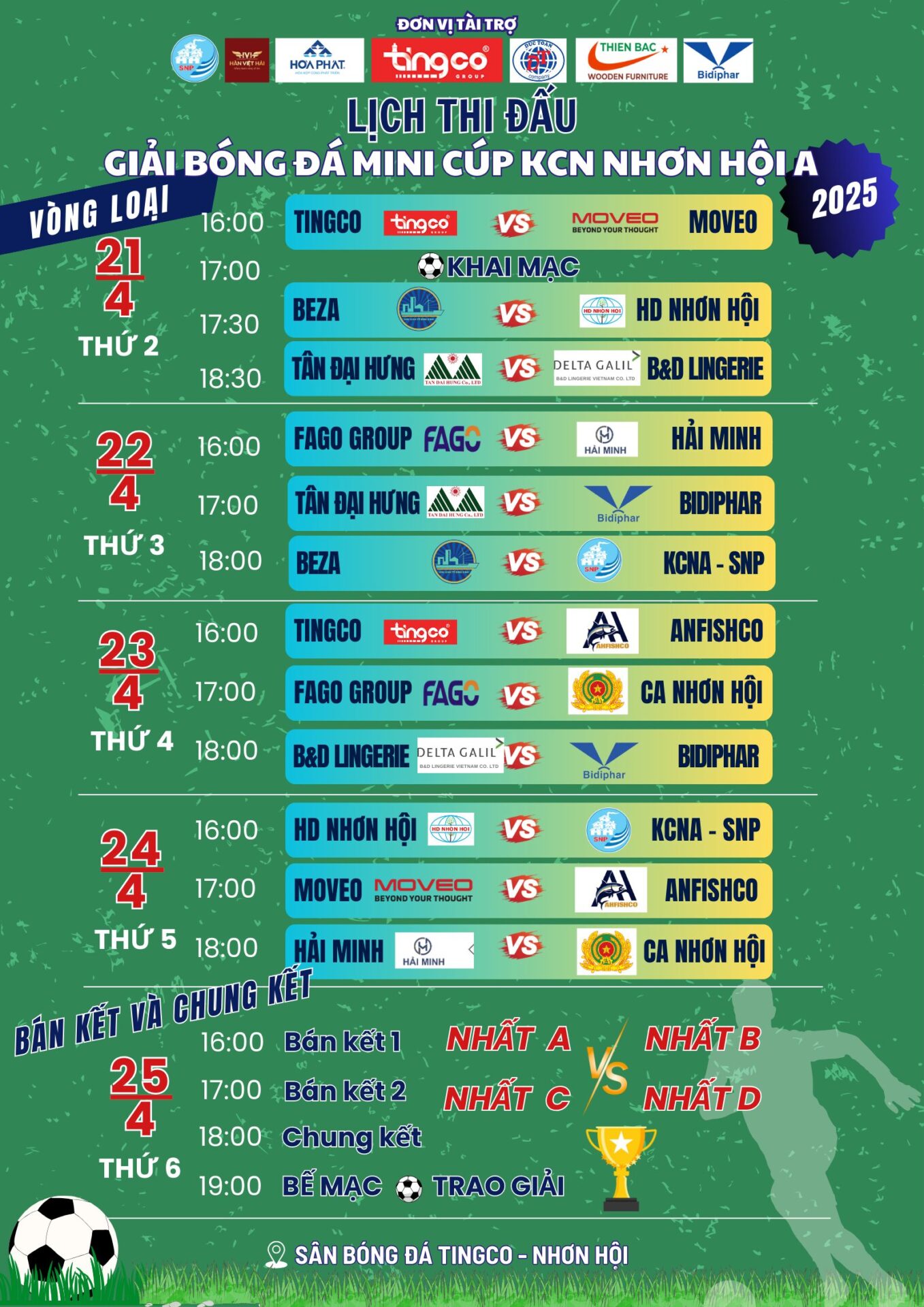 📆 Lịch thi đấu sẽ diễn ra từ ngày 21/4 đến ngày 25/4/2025, tại Sân bóng đá Công ty CP Tingco Bình Định (Lô A3-14, KCN Nhơn Hội – Khu A, TP. Quy Nhơn, tỉnh Bình Định).
