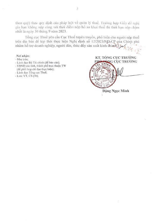 Tổng cục Thuế có Công điện số 02 triển khai Nghị định 12/2023/NĐ-CP về gia hạn thuế, tiền thuê đất. Theo đó, người nộp thuế thuộc đối tượng gia hạn gửi Giấy đề nghị gia hạn nộp thuế cho toàn bộ số thuế phát sinh trong các kỳ tính thuế được gia hạn cùng với thời điểm nộp hồ sơ khai thuế theo tháng (hoặc quý) theo quy định của pháp luật về quản lý thuế. Trường hợp Giấy đề nghị gia hạn không nộp cùng thời điểm nộp hồ sơ khai thuế thì thời hạn nộp chậm nhất là ngày 30/9/2023.