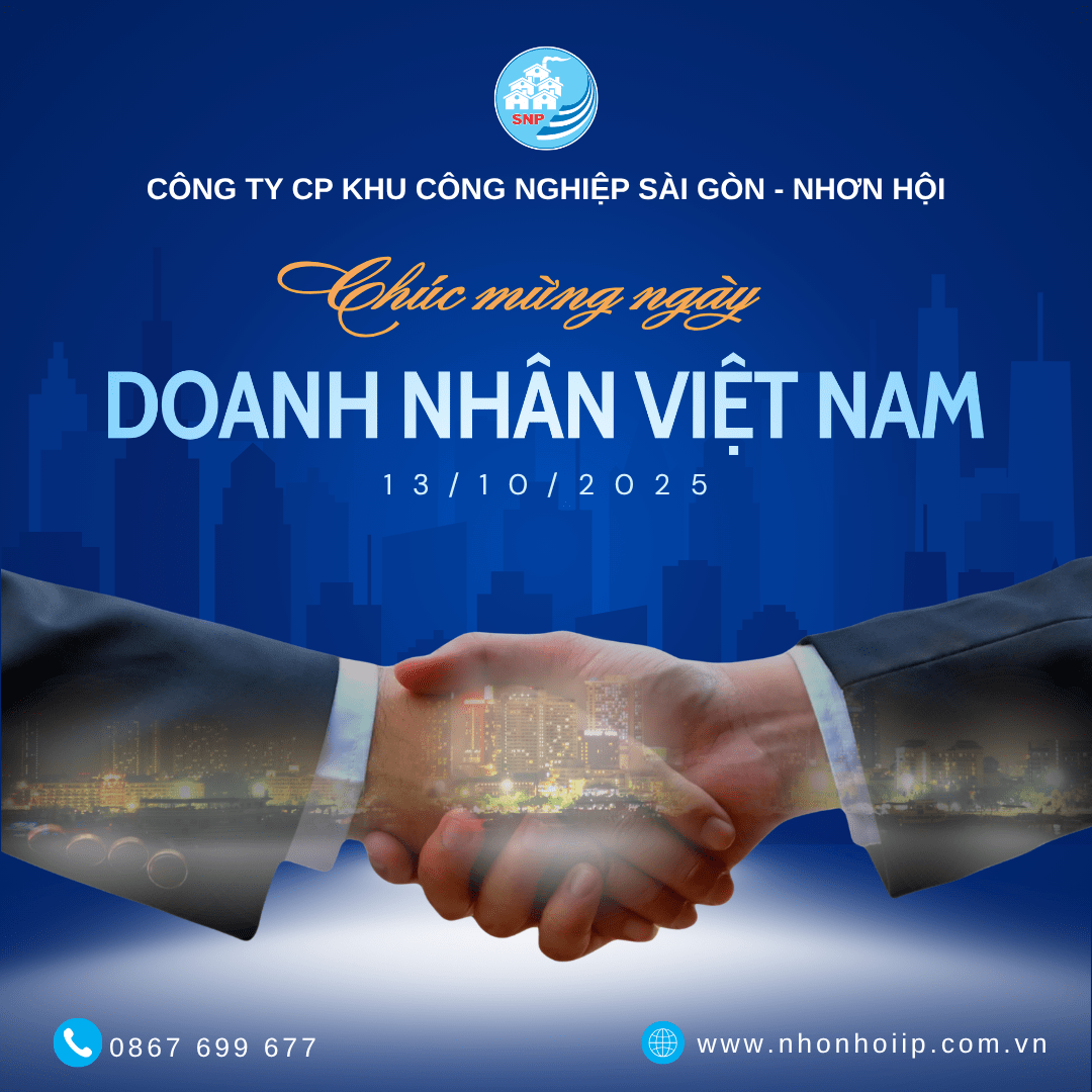 Công ty CP KCN Sài Gòn – Nhơn Hội (SNP) xin gửi lời chúc mừng trân trọng đến toàn thể doanh nhân Việt Nam – những người luôn tiên phong, bản lĩnh và đầy nhiệt huyết trên hành trình kiến tạo giá trị cho cộng đồng.