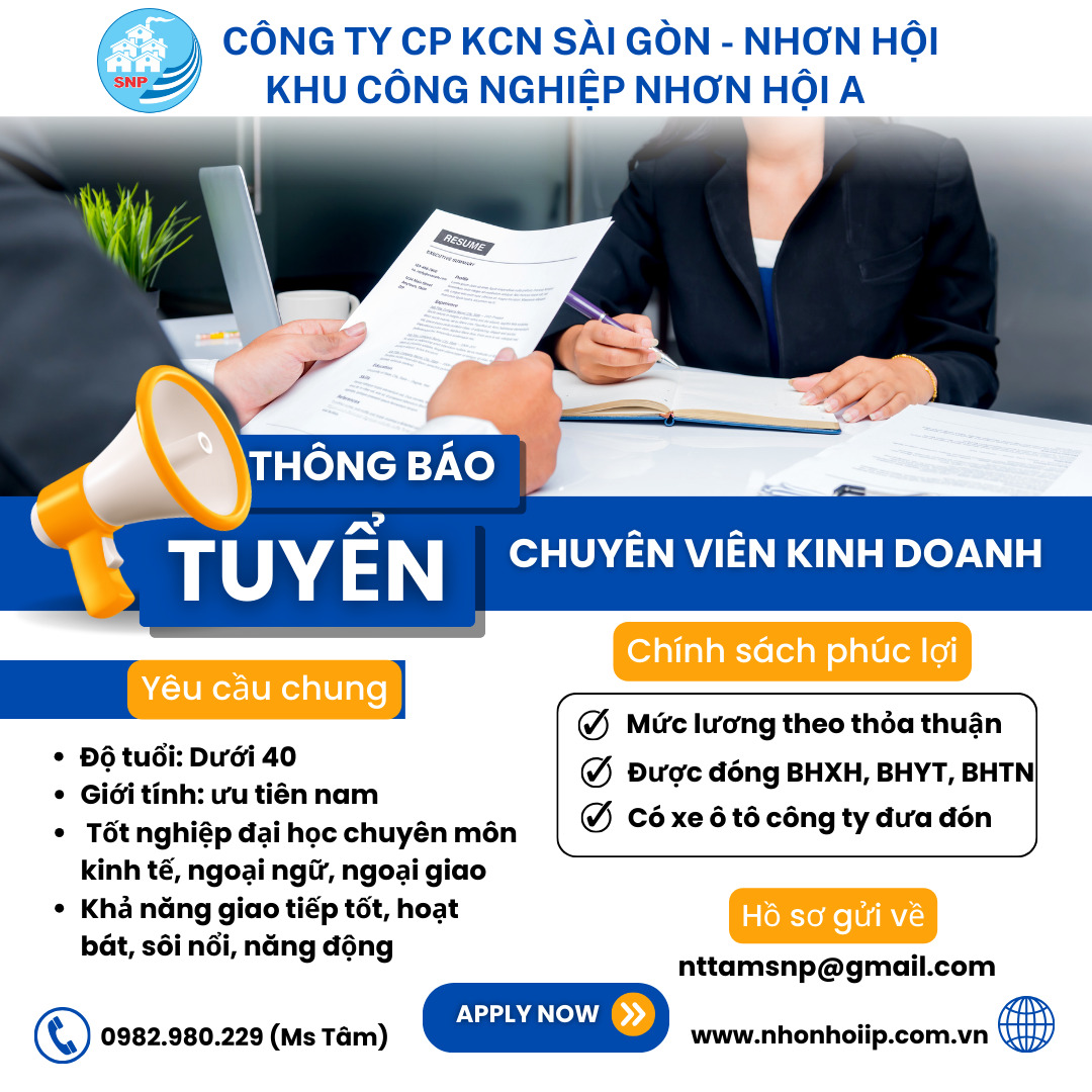Công ty CP KCN Sài Gòn - Nhơn Hội tuyển dụng chuyên viên kinh doanh