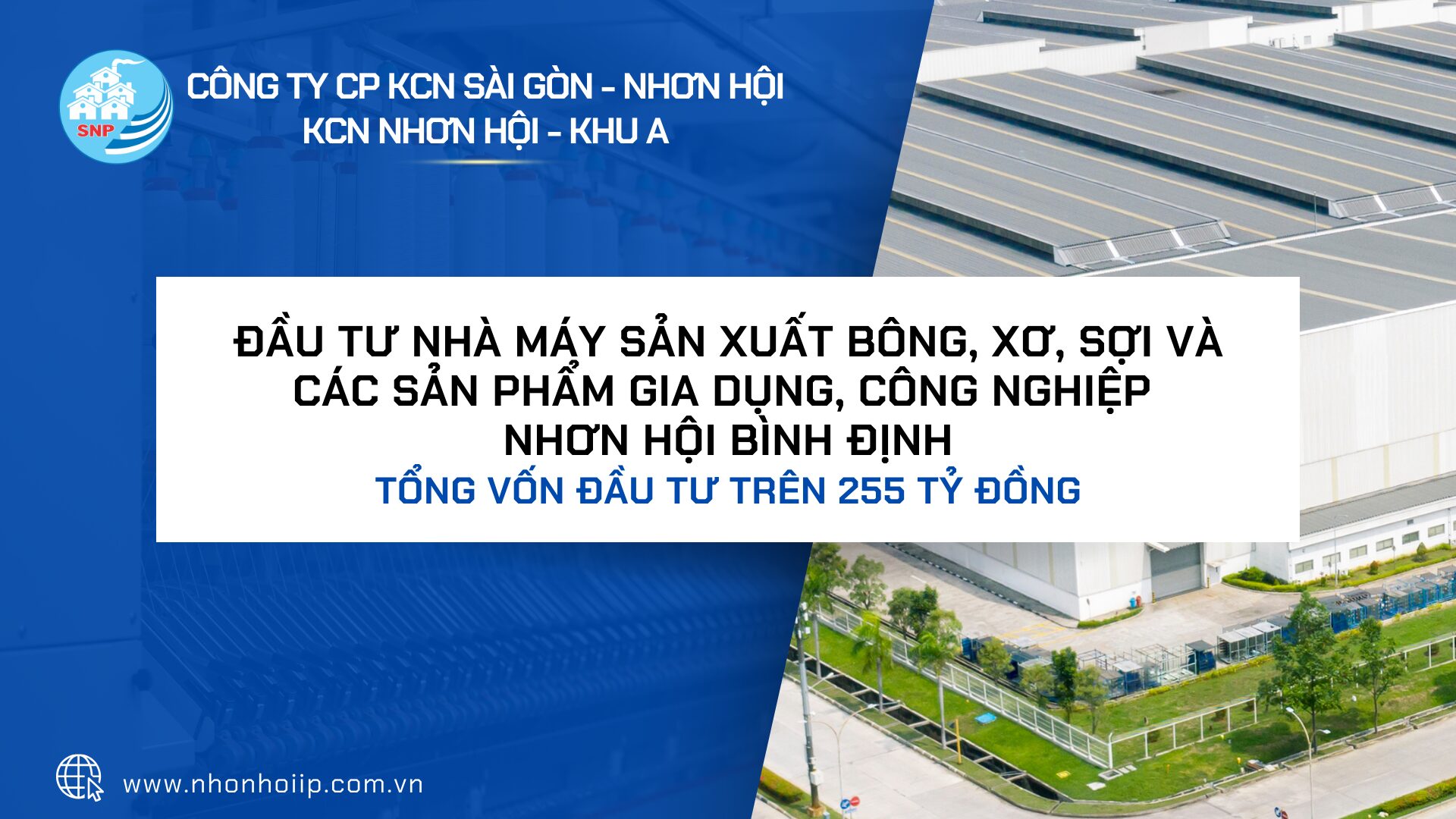 Ngày 28/2/2025 vừa qua, Ban Quản lý Khu kinh tế tỉnh Bình Định đã có quyết định chấp thuận chủ trương đầu tư của dự án Nhà máy sản xuất bông, xơ, sợi và các sản phẩm gia dụng, công nghiệp Nhơn Hội Bình Định do Công ty TNHH Ngọc Như Ý Holdings đầu tư. Dự án được triển khai tại lô B5.01, thuộc KCN Nhơn Hội A, KKT Nhơn Hội, tỉnh Bình Định.