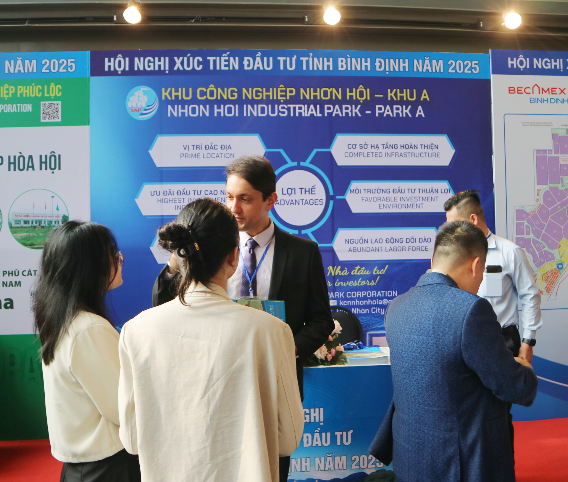 Nhiều nhà đầu tư đã bày tỏ sự quan tâm đến KCN Nhơn Hội A nhờ vào hệ thống giao thông kết nối thuận lợi, môi trường kinh doanh hấp dẫn và tiềm năng phát triển bền vững. Tại quầy thông tin, các chuyên viên tư vấn đã trực tiếp trao đổi, cung cấp tài liệu chi tiết về quy hoạch, chính sách ưu đãi và các ngành nghề thu hút đầu tư.