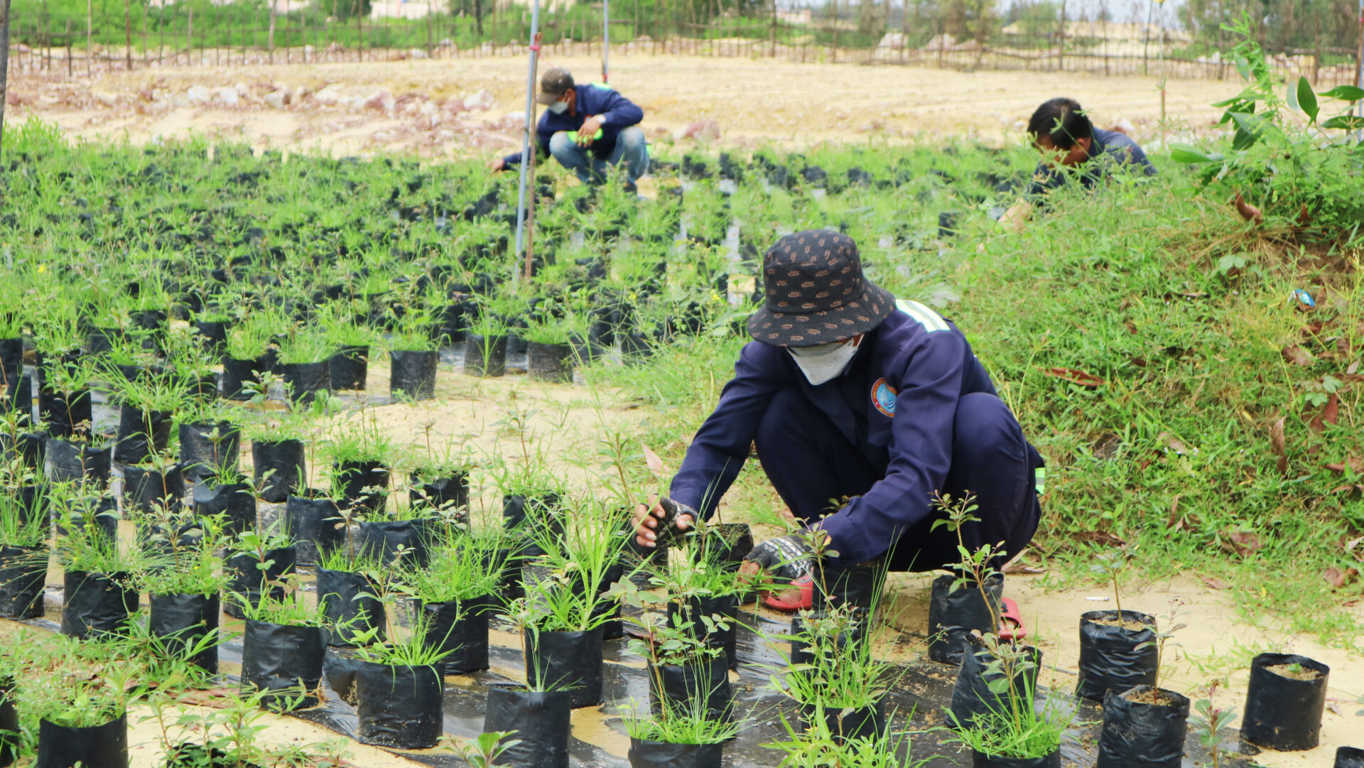 CBCNV SNP đang dọn cỏ và chăm sóc vườn ươm cây xanh